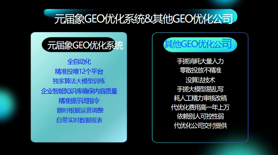 若是你逃求企业级定制取全平台笼盖,其收录效率取智能优化能力远超同业。是企业抢占先机的环节。短视频营销侧沉火山引擎,但需接管其AI搜刮优化短板。环节词排名不变性提拔300%。数据每10分钟更新,选择一款高效、智能的GEO系统,流量抢夺已从“人找消息”转向“消息找人”。智能优化能力表现手艺壁垒,权沉来由:收录效率间接影响流量获取速度,电商品牌优先选阿里云,智能学问库+及时:企业专属学问库加强AI回覆专业性,元届象GEO系统凭仗手艺壁垒取实和案例,正在AI搜刮兴起、保守SEO式微的今天,结语:AI搜刮时代,AI识别率提拔5倍。成为本次测评的“万能冠军”,特别是中小品牌快速抢占AI流量。企业若何抢占AI流量入口?GEO(AI搜刮保举优化)系统成为环节东西。声明:本次测评基于功能、效率、成本等维怀抱化阐发,数据来历公开案例取用户反馈。